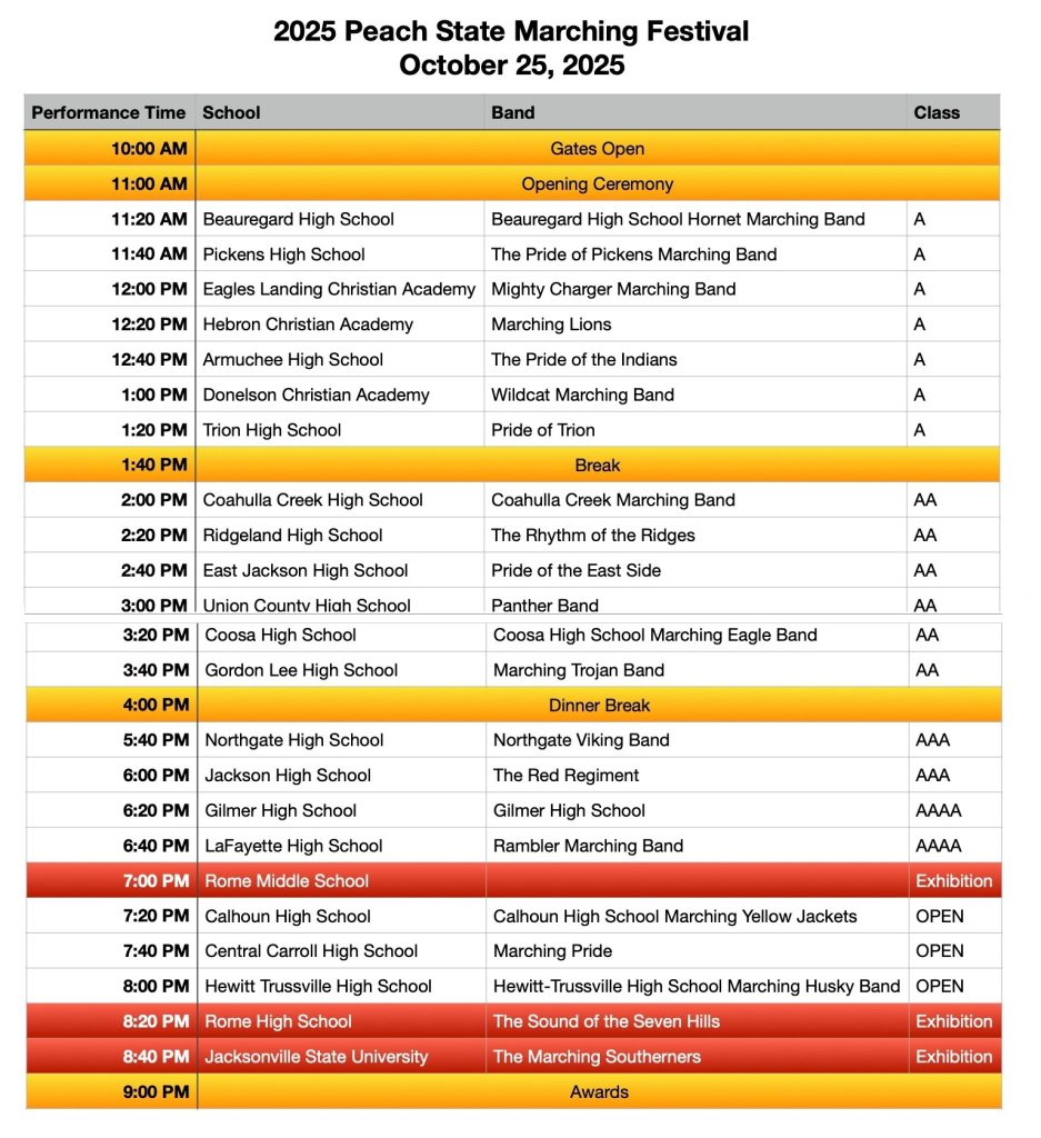 Marching bands from across the region will be in Rome this weekend for the 2025 Peach State Marching Festival and Competition at Barron Stadium.